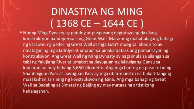 Naging tirahan ng mga emperador noong dinastiyang ming ang great wall. Only Chinese shipping seems to have been quite important during the last years of the Ming dynasty. Naimbento ang gunpowder na ginamit sa paggawa ng mga paputok Naimbento rin ang from SOCDIMENS 1 at Nueva Ecija University of Science and Technology. Panandaliang naging kabisera ng Tsina ang Wuhan noong 1927 sa ilalim ng kaliwang kapulungan pamahalaan ng Kuomintang KMT na pinamunuan ni Wang Jingwei.
