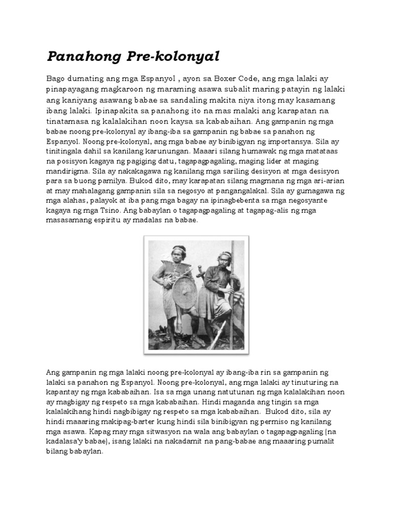18112019 Magsagawa ng pananaliksik tungkol sa naging katatayuangampanin ng babae at lalaki. Ang mga lalaki ay naging alipin ng mga Espanyol sa kung ano ang maaari nilang maipagawa sa mga Pilipino. 22022021 Malayo rin ang mga gampanin noong panahon ng mga Espanyol kumpara sa gampanin ng babae at lalaki sa kasalukuyang panahon.